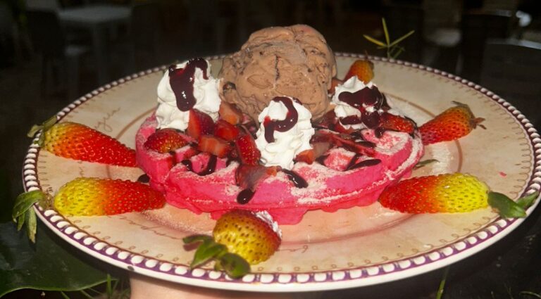 Waffle de fresa ,leche en polvo salsa de chocolate, fresa, una bola de helado, chantilly